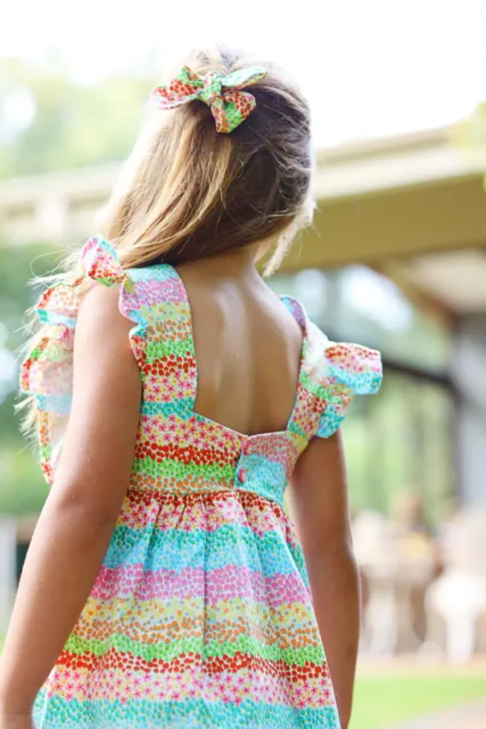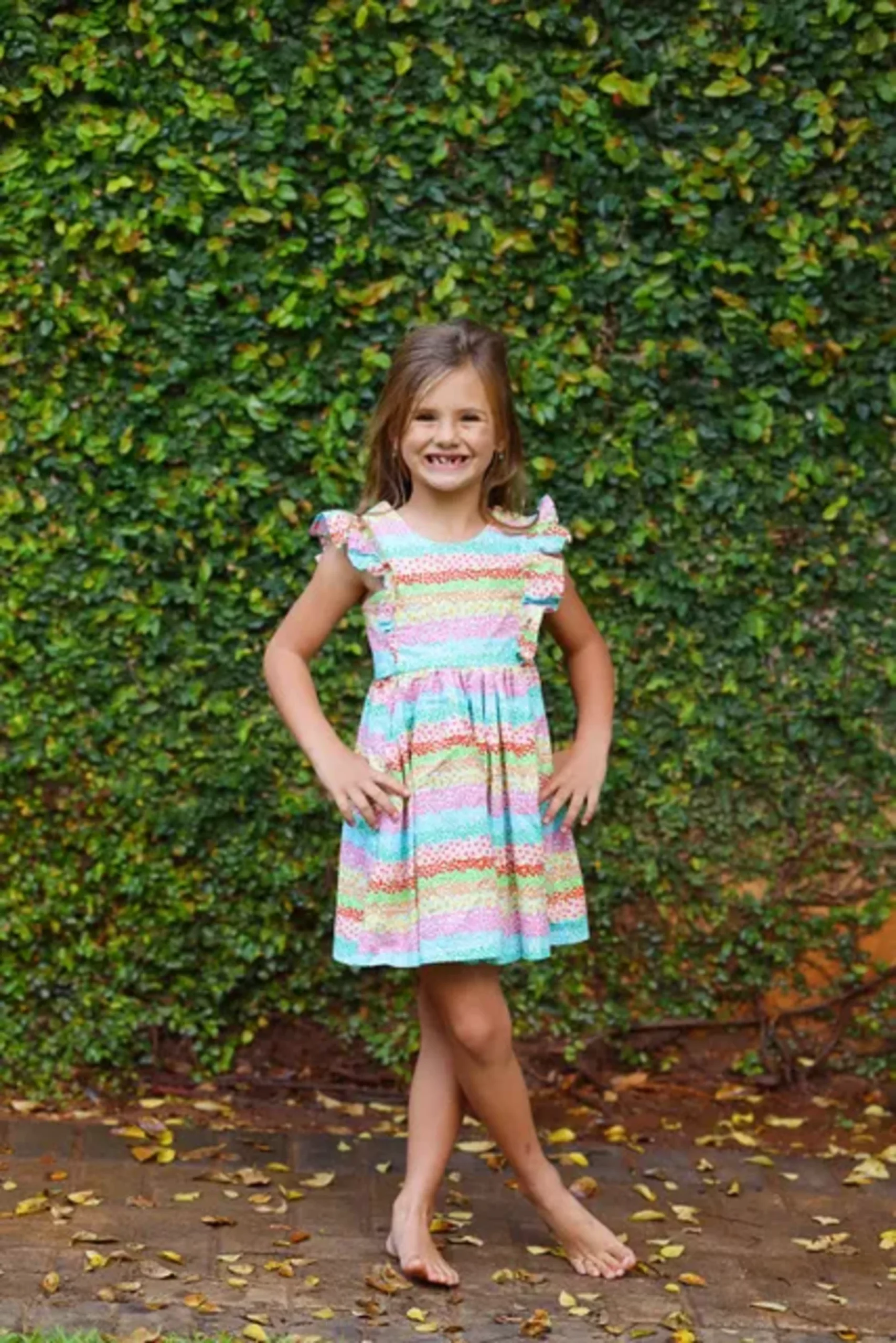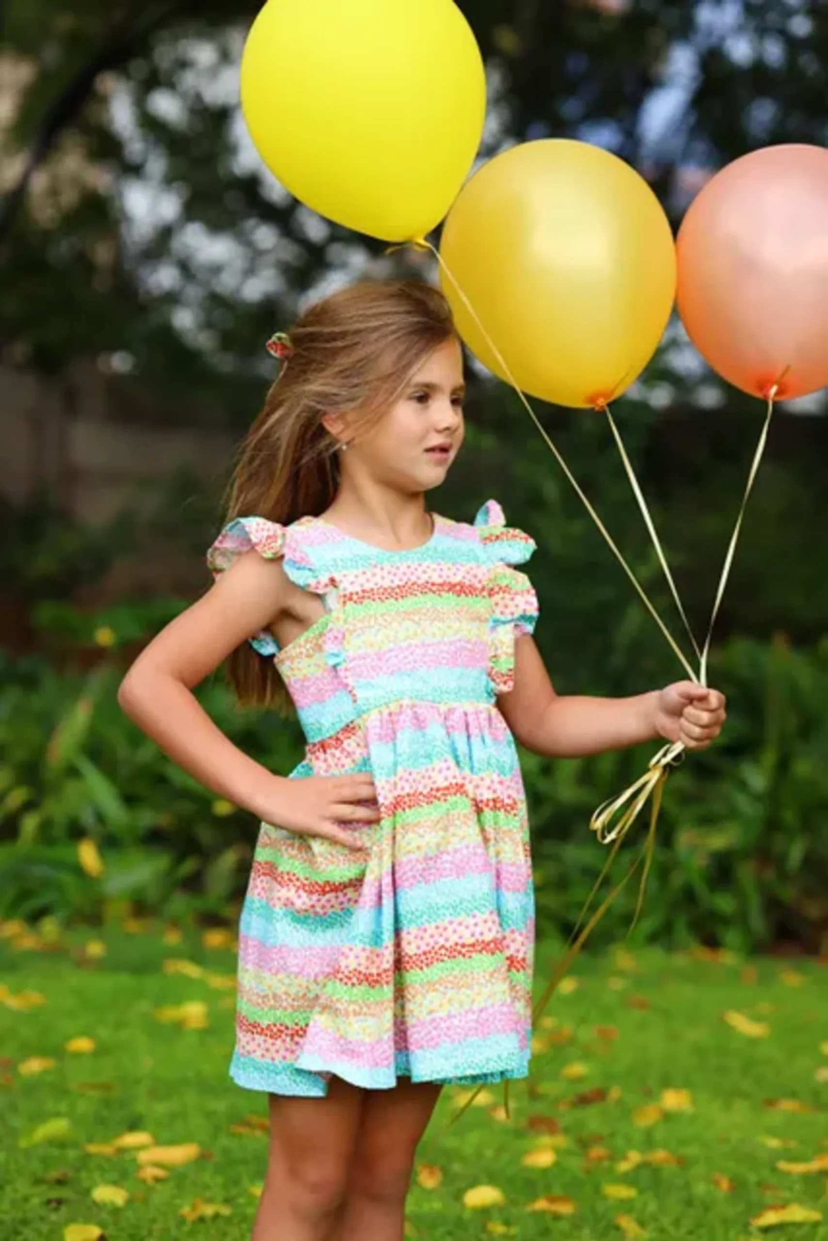 Erica is a vintage length, soft and feminine dress made from woven (non-stretch) fabric. It boasts a ruffle front top that continues down the straps at the back. Snaps at the back allows for easy fastening. The beautiful flounce sleeves give it a playful look and the back will keep your girl cool in the hot summer days. All Once Upon A Thread dresses has a lined bodice and is from woven (non-stretch) 100% cotton fabric.